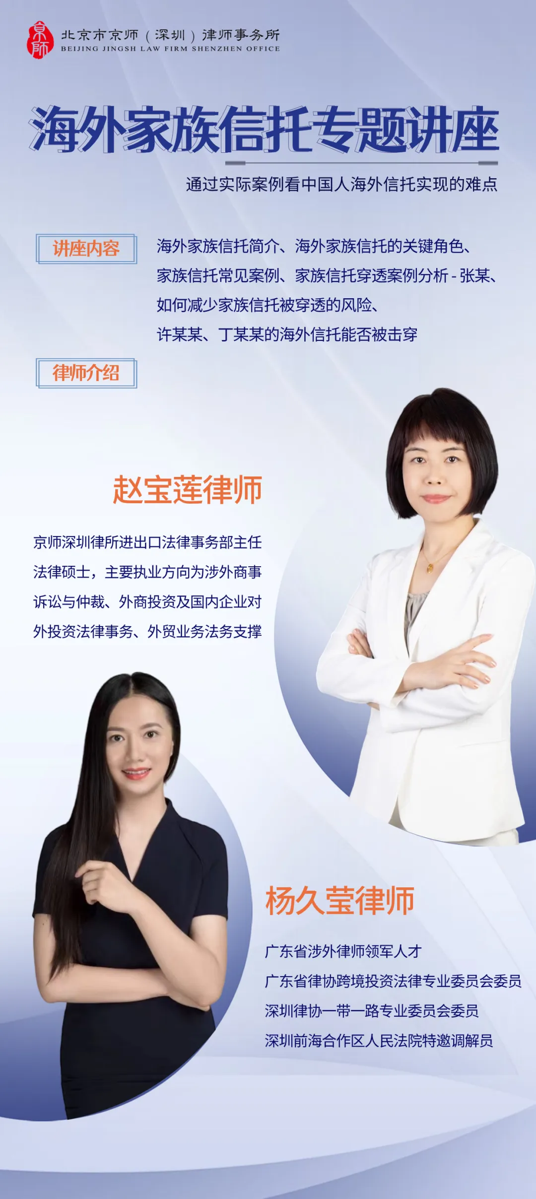 2024年5月10日上午,京師深圳律所舉行海外家族信托專題講座,此次講座由趙寶蓮律師和楊久瑩律師主講,兩位律師通過實(shí)際案例看中國人海外信托實(shí)現(xiàn)的難點(diǎn)。...