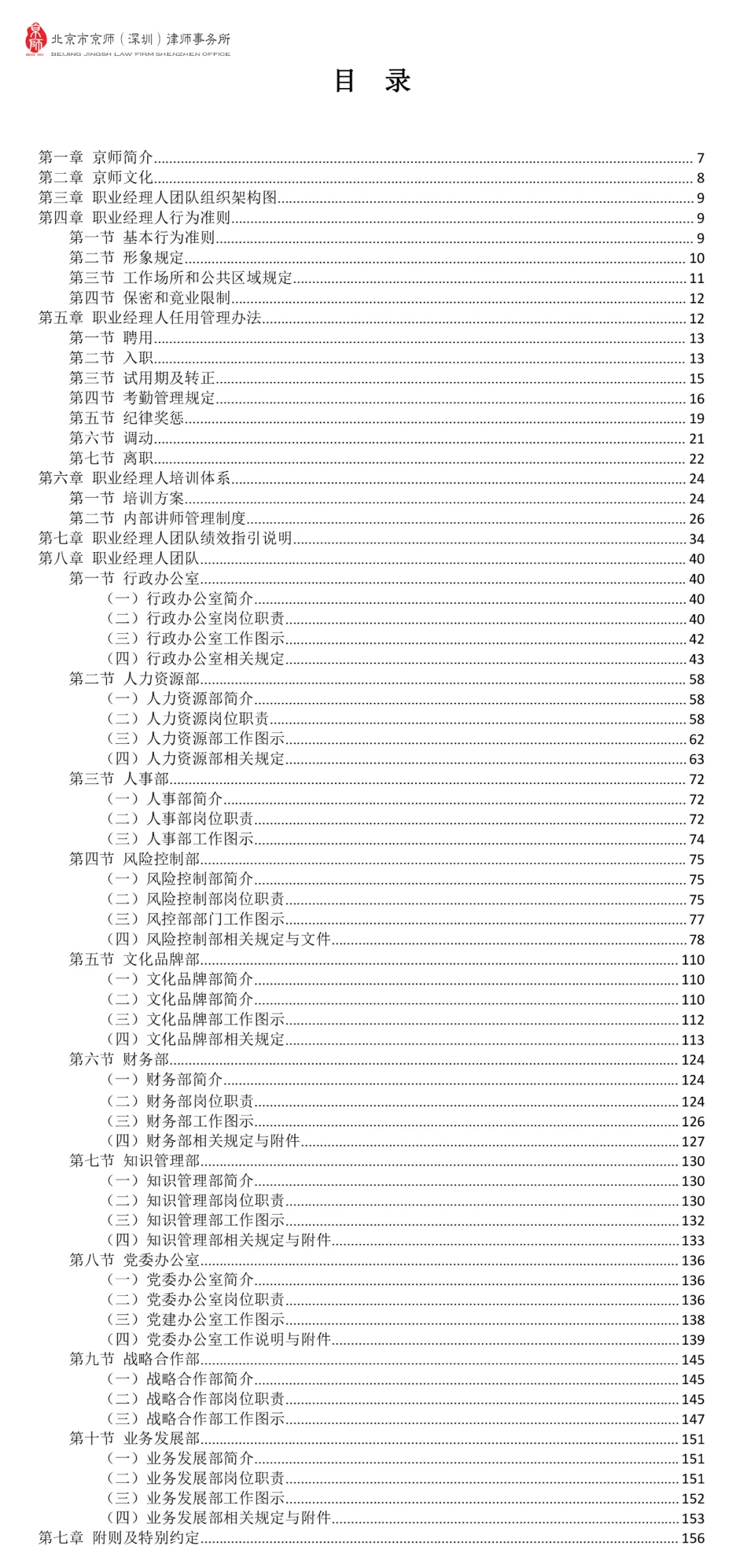 本工作手冊結合思維導圖,系統介紹京師深圳律所職業(yè)經理人十個部門的組織架構、工作內容、規(guī)章制度,更加清晰地展示一個全方位職業(yè)化、專業(yè)化的服務團隊。