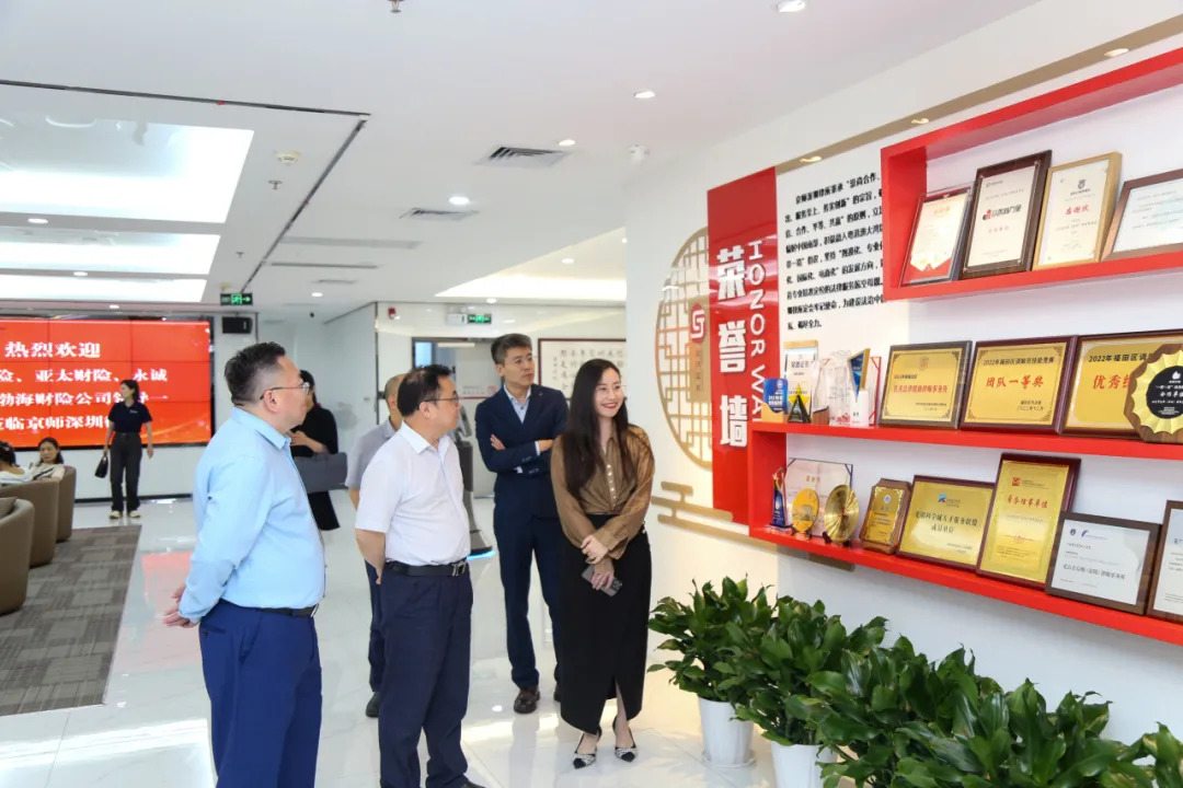 會(huì)前,大家財(cái)險(xiǎn)、亞太財(cái)險(xiǎn)、永誠財(cái)險(xiǎn)、渤海財(cái)險(xiǎn)四大保險(xiǎn)公司一行在京師深圳律所戰(zhàn)略運(yùn)營部總監(jiān)張玲的帶領(lǐng)下參觀了律所的榮譽(yù)墻、圖書墻、黨建文化墻等區(qū)域,了解律所文化和辦公環(huán)境。