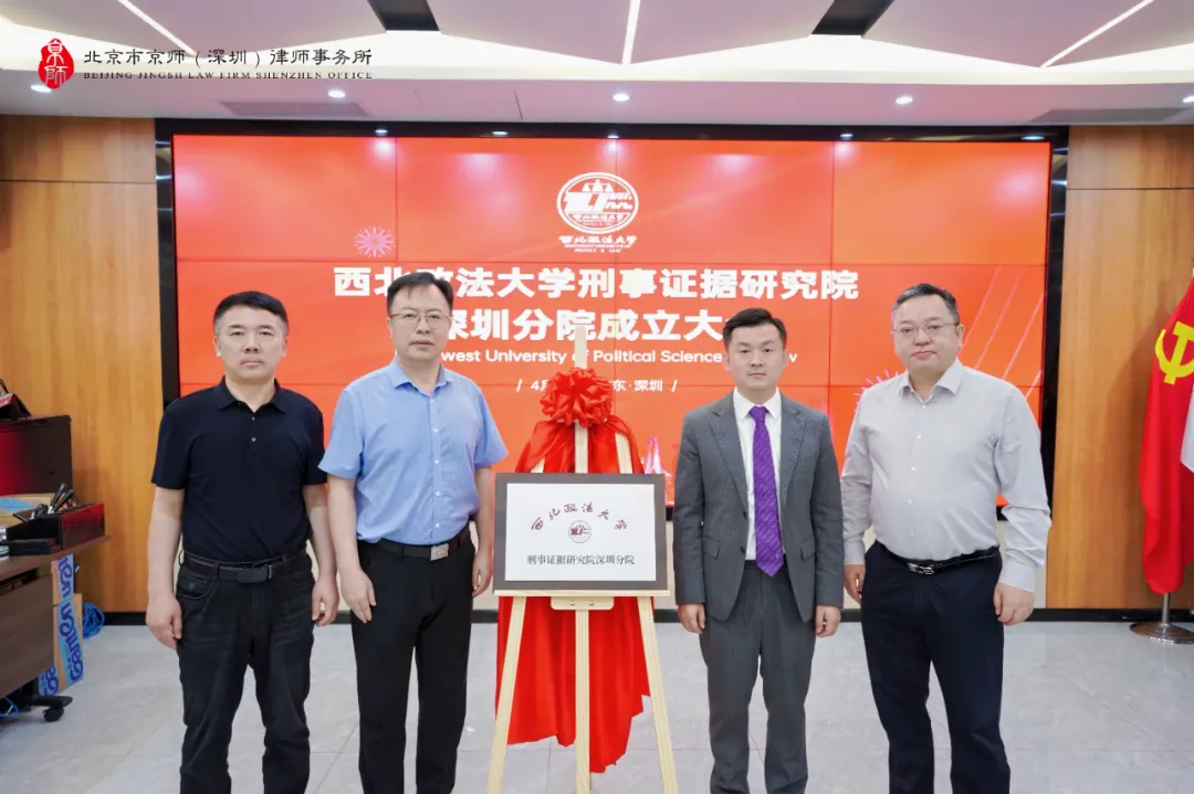 閆小軍院長(zhǎng)、申飛飛副院長(zhǎng)與京師深圳律所陳旭明主任、張楨主任共同為"西北政法大學(xué)刑事證據(jù)研究院深圳分院"揭牌,現(xiàn)場(chǎng)響起熱烈掌聲,共同見(jiàn)證這一重要時(shí)刻。