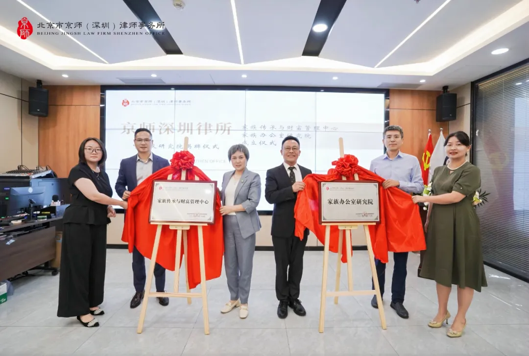 深圳市律協(xié)家族財富管理法律專業(yè)委員會主任李魏,京師深圳律所聯(lián)合創(chuàng)始人、執(zhí)行主任陳修,家族傳承與財富管理中心四位主任李志忠、劉運(yùn)嬌、康雪崧、張楓共同為京師深圳律所"家族傳承與財富管理中心"暨"律所家族辦公室研究院"揭牌,正式宣告其成立。