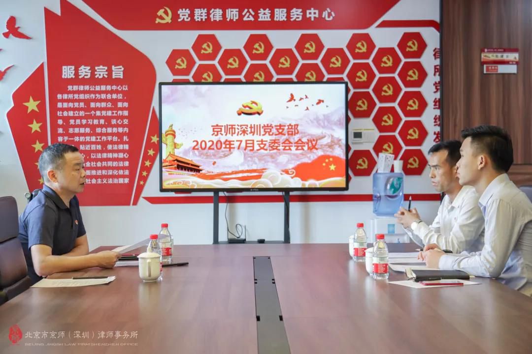 2020年7月2日,京師深圳黨支部舉行7月支部委員會會議,京師深圳黨支部書記林冰律師、組織委員甘伍葉律師、宣傳委員容韻雅律師(線上)、黨建辦吳俊雄參與了會議。