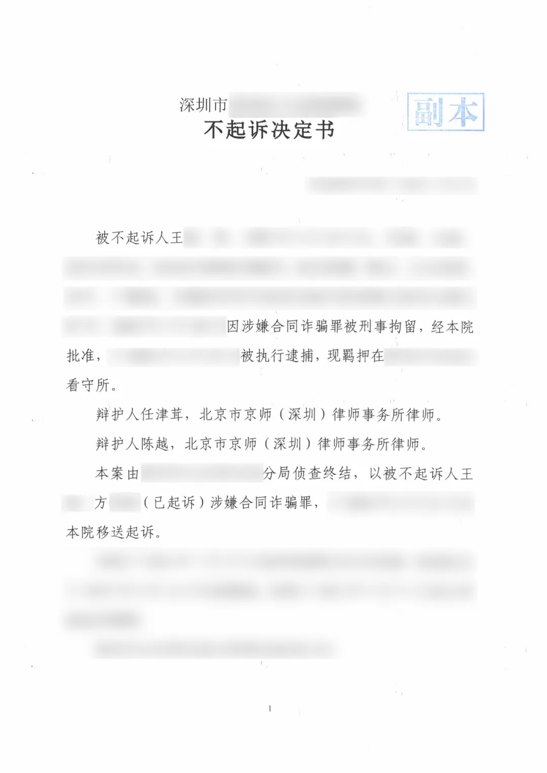 近日,北京市京師(深圳)律師事務(wù)所任津茸律師、陳越律師收到一份對(duì)當(dāng)事人王某的不起訴決定書。因涉嫌合同詐騙而被羈押的王某,在金秋國慶前得以釋放,重獲自由,與家人團(tuán)圓歡度佳節(jié)。
