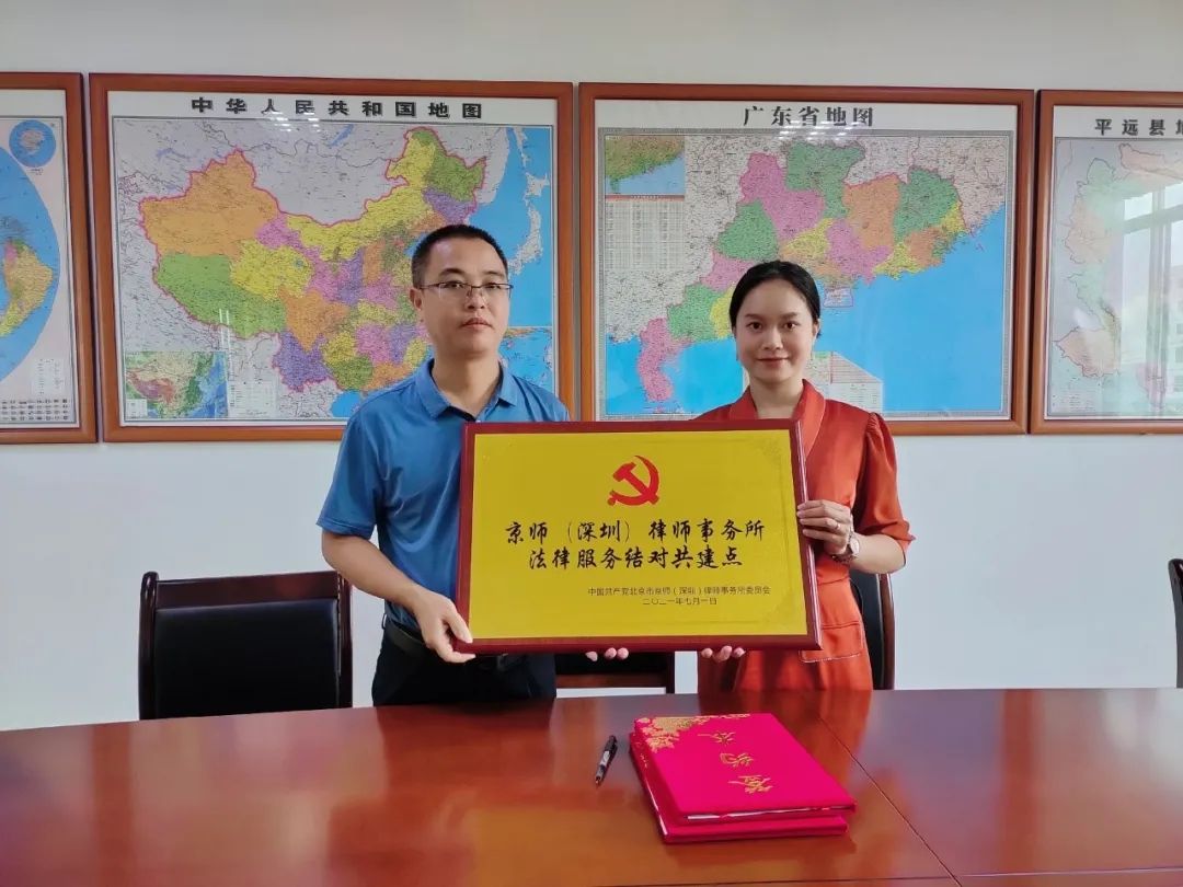 日前,京師深圳律所黨委宣傳委員容韻雅律師再赴梅州,代表京師深圳黨委與中共平遠(yuǎn)縣公益義工協(xié)會(huì)黨支部、中共廣州南山(平遠(yuǎn))產(chǎn)業(yè)轉(zhuǎn)移工業(yè)園委員會(huì)簽署黨建聯(lián)建結(jié)對(duì)共建協(xié)議,成立了法律服務(wù)結(jié)對(duì)共建點(diǎn)。以黨建為橋梁,將專(zhuān)業(yè)法律服務(wù)送至協(xié)會(huì)、企業(yè)。據(jù)了解,義工協(xié)會(huì)經(jīng)常組織下鄉(xiāng)幫助困難群眾,京師深圳律所黨委可以此為契機(jī),堅(jiān)持以人民為中心,將法律服務(wù)送至基層,送至群眾身邊,充分體現(xiàn)共產(chǎn)黨的根基和血脈在人民。